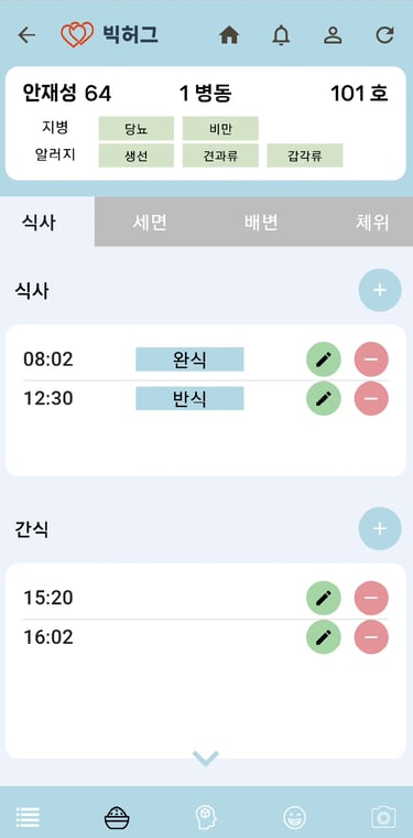 식사 기록은 완식·반식·거부 등 선택형으로 구성돼 기록의 일관성을 유지합니다.